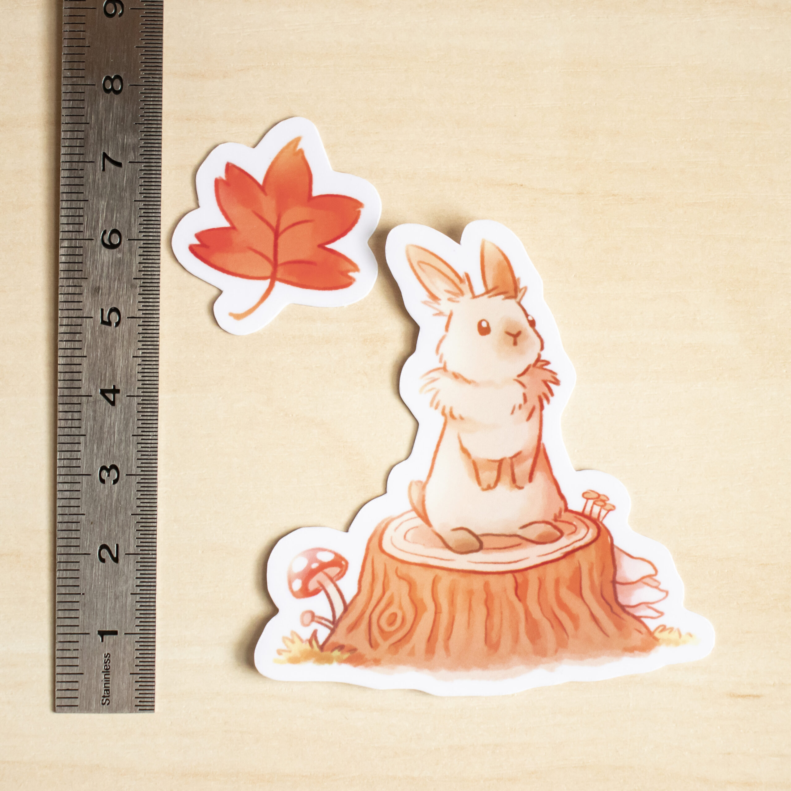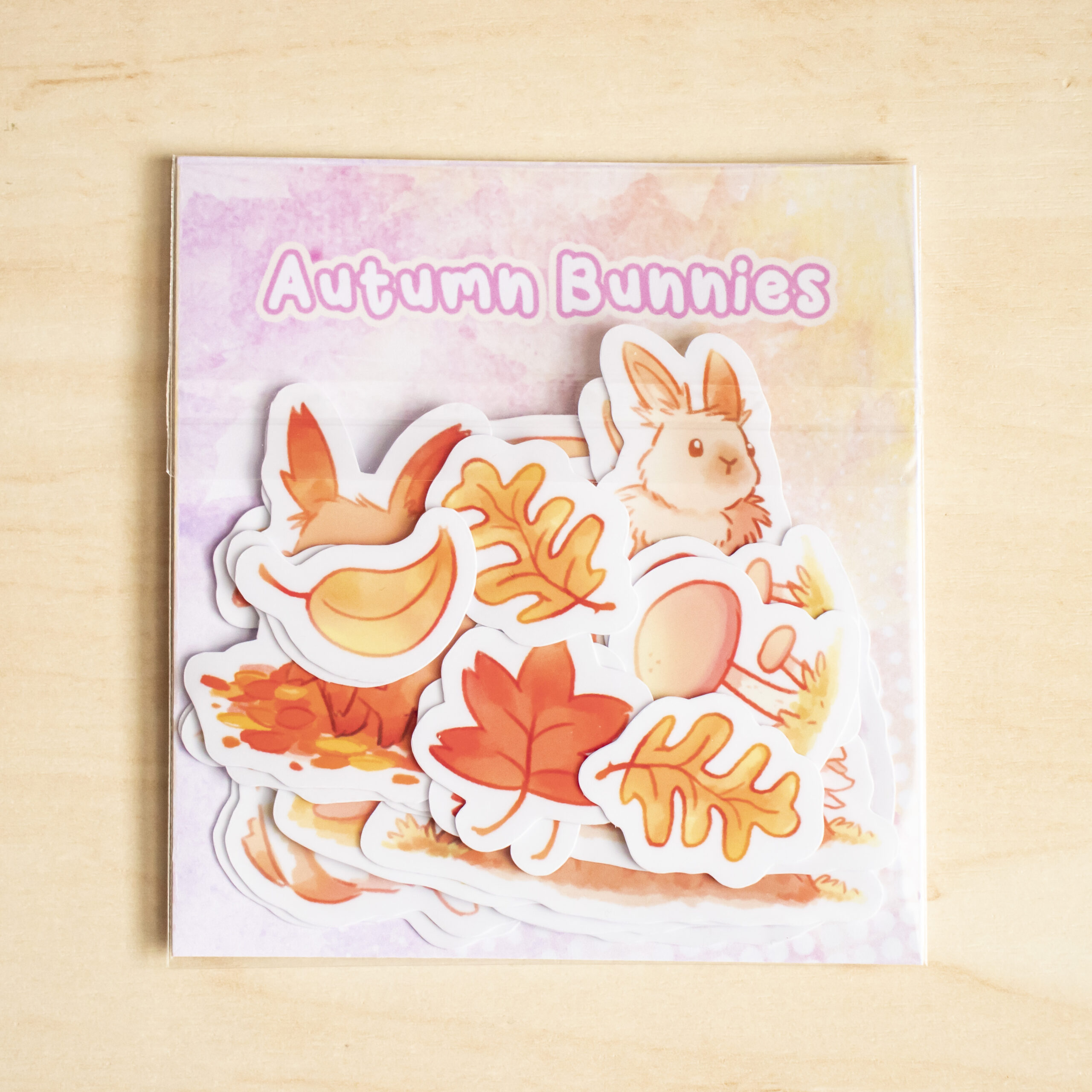 A cute autumn based bunny sticker set. This set contains 2 x 5 different bunny stickers, alongside some additional leaf stickers.