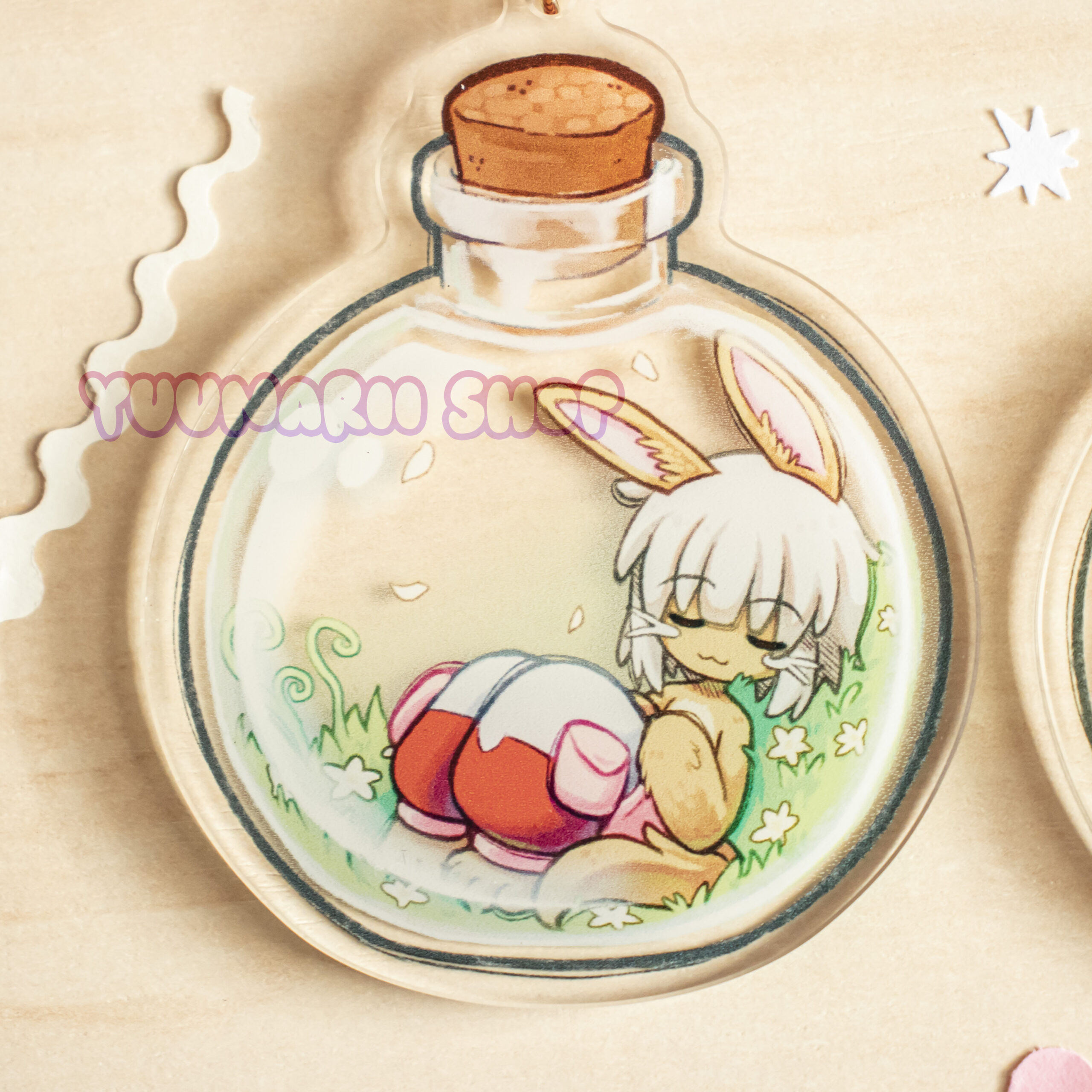 Two adorable keychain designs featuring Nanachi and Faputa from “Made in Abyss”, sleeping inside a glass bottle. Stock is limited.