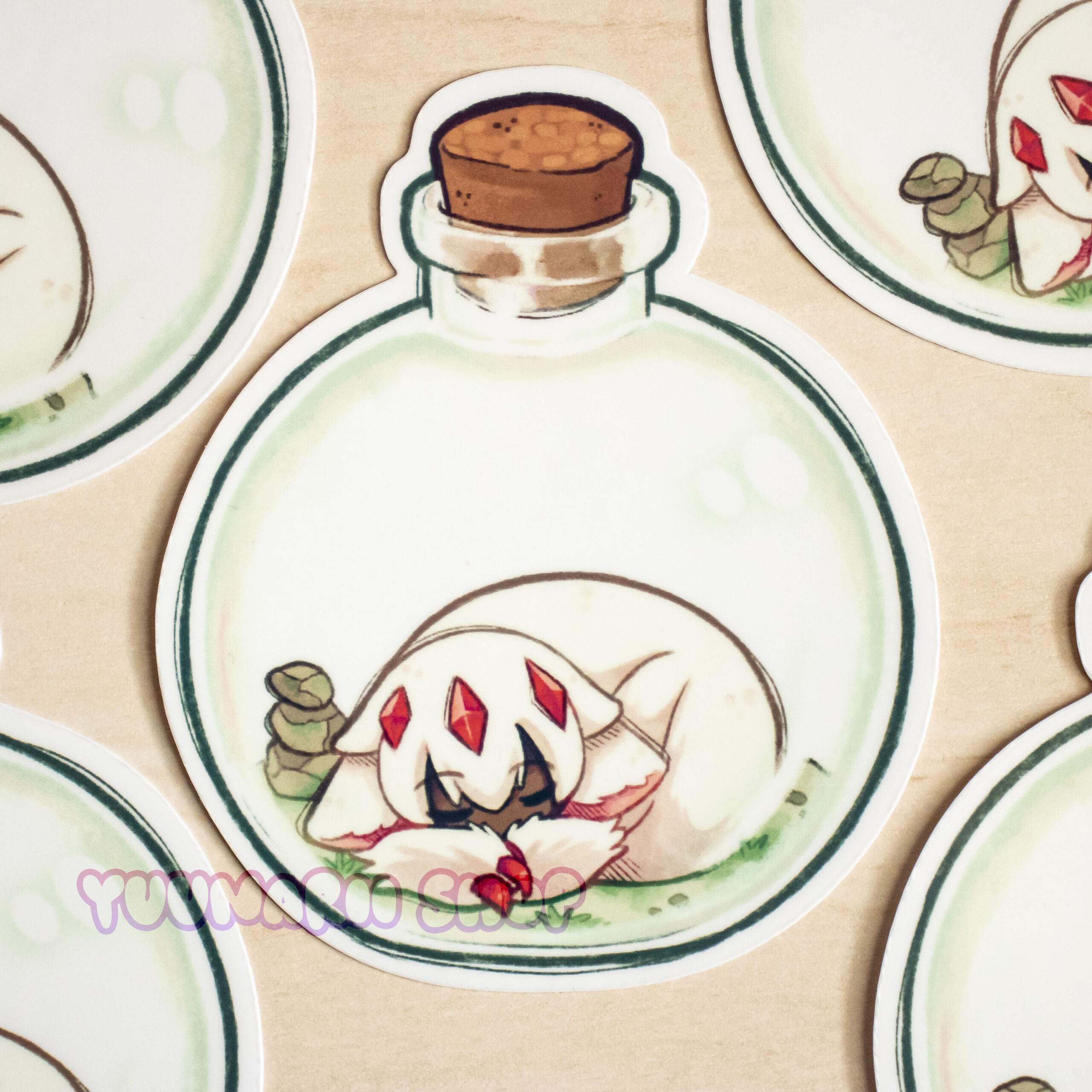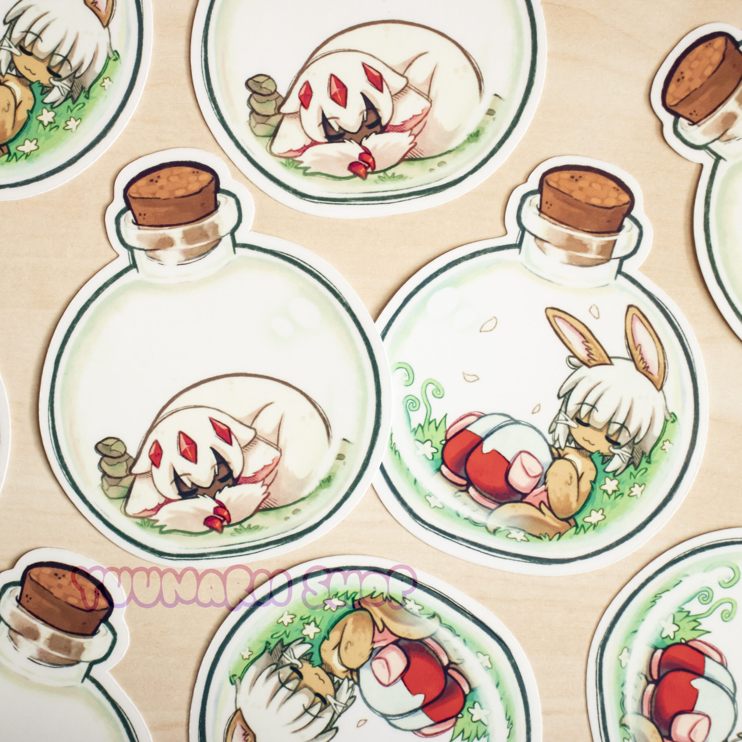 Two very cute vinyl stickers of Nanachi and Faputa from “Made in Abyss”, sleeping inside of glass bottles. Stickers are available as plain or holographic. The holographic variant will have a rainbow hue overlay.