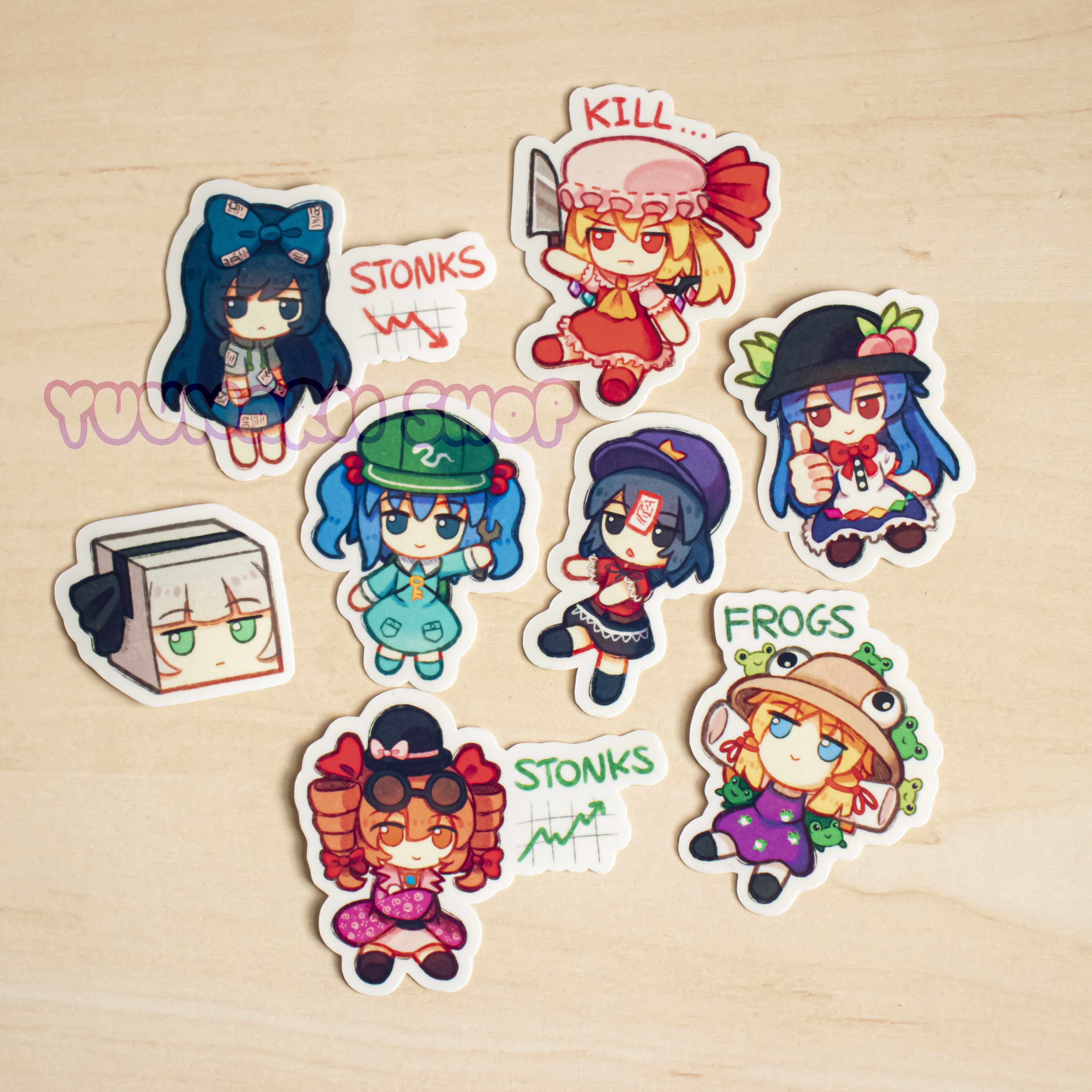 Volume 2 of my mini fumo stickers. A mini vinyl sticker set with 8 different adorable Touhou Fumo characters. Based on the plushie series by GIFT. Characters featured include: Flandre Scarlet, Youmu Konpaku, Tenshi Hinanawi, Nitori Kawashiro, Suwako Moriya, Yoshika Miyako, Yoon Yorigami and Shion Yorigami.